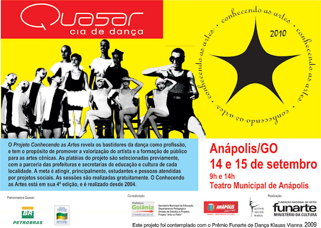 A Quasar Cia de Dança apresenta seus espetáculos para cerca de 9.000 crianças e pré-adolescentes matriculados em escolas da rede pública estadual de ensino, na quarta edição do projeto Conhecendo as Artes.As primeiras performances estão marcadas para esta semana, dias 11 e 14 de junho, na cidade de Quirinópolis. O Conhecendo as Artes é um projeto para a democratização do universo das artes, com foco na dança como profissão. Esta edição, ampliada para outros municípios do estado de Goiás, é realizada com o patrocínio da Funarte, por meio do Prémio de Dança Klauss Vianna – Ano 2009.